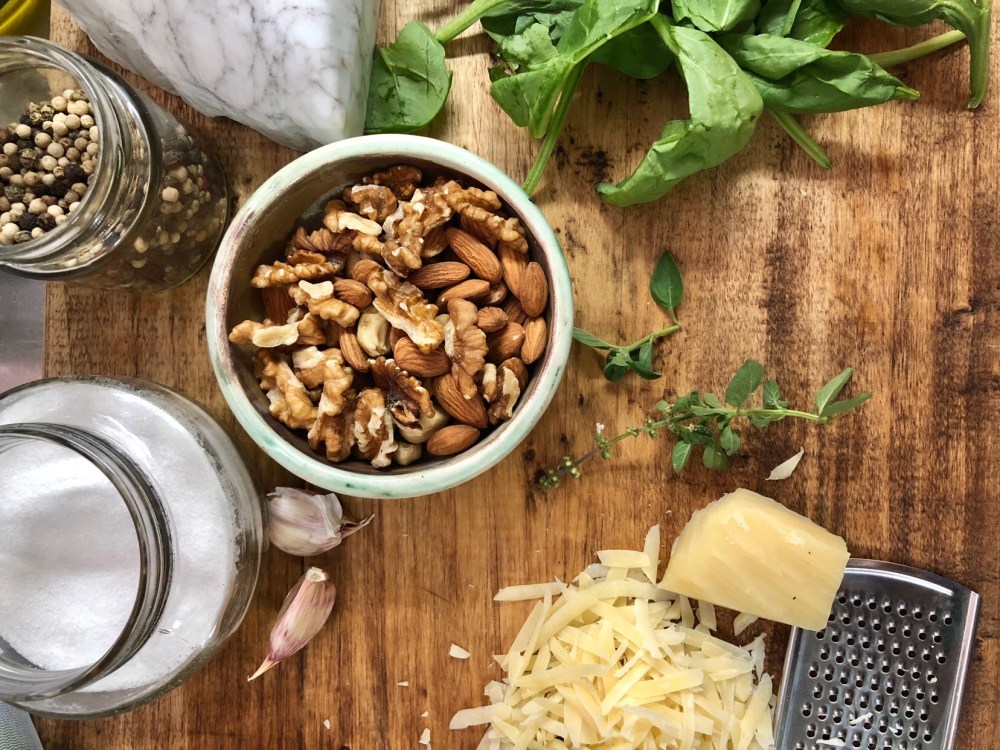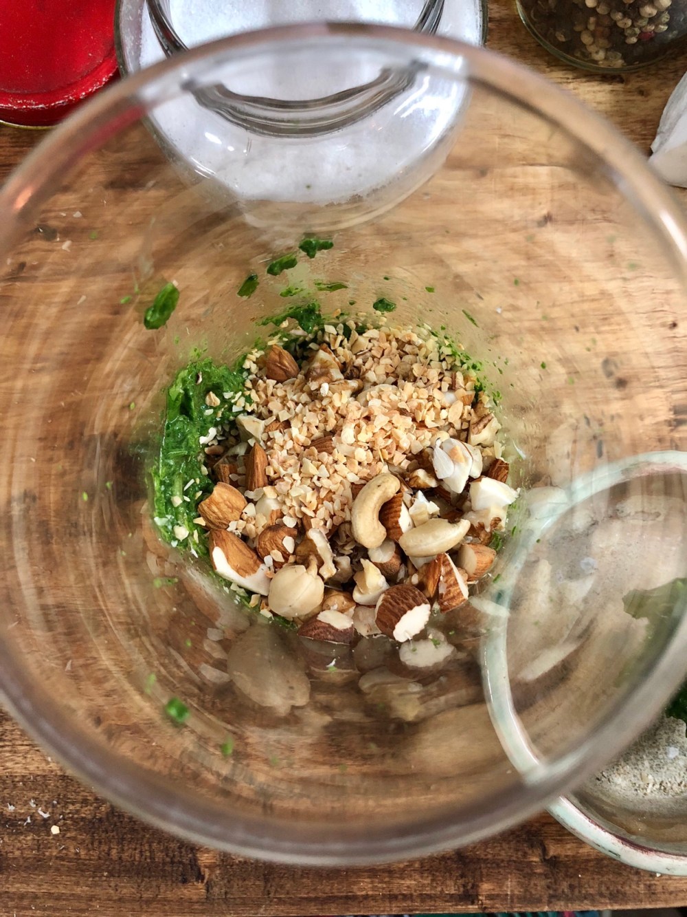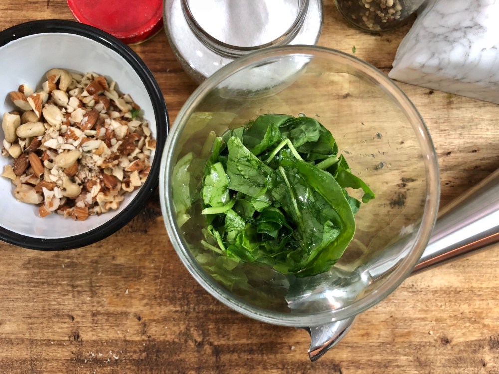 - En mixer o picadora poner las hojas de espinaca y albahaca con un poco de aceite de oliva y el jugo de limón. Procesar un poco. Luego agregar los frutos secos, el queso parmesano rallado, el ajo triturado y un poco más de aceite de oliva, a ojo. Procesar un poco más.