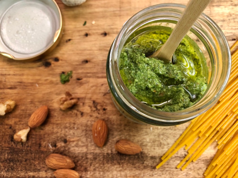 Una idea para la pasta del domingo, para untar en sándwiches o agregar a ensaladas. Pesto a mi entender vale de lo que a uno le dé la gana. A veces hago de más y lo guardo fraccionado en el freezer, te salva en cualquier momento.