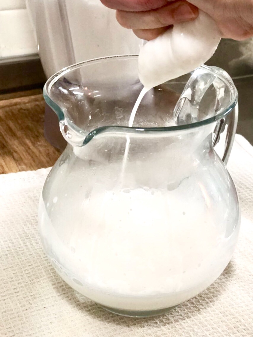 Vas a necesitar una licuadora, una bolsa para hacer leches vegetales (se compra en dietéticas; yo al principio comencé haciéndola con filtro de tela de café) y una botella para guardarla.