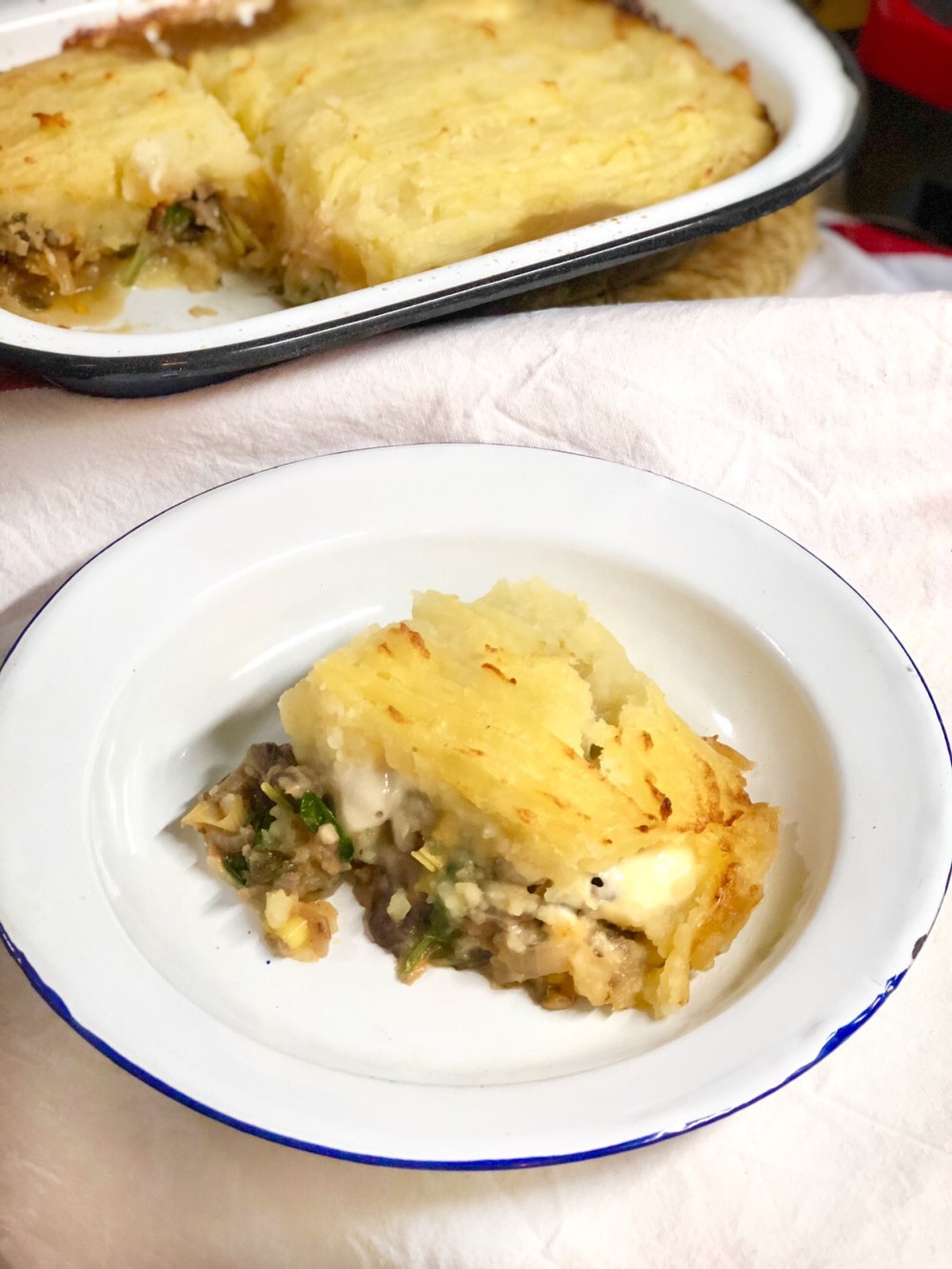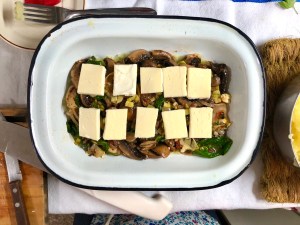- Pincelamos una fuente apta para horno con unas gotas de aceite de oliva y ponemos una fina capa de puré de papas. Sobre ella acomodamos el relleno de champiñones, y sobre ésta láminas de queso fresco. Cubrimos con el resto del puré de papas, y terminamos con trocitos de manteca por arriba.