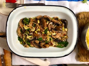 - En una sartén ponemos las 2 cdas de provenzal, agregamos el puerro y la cebolla picados y rehogamos unos minutos; luego agregamos los champiñones fileteados, la salsa de tomate y por último el puñado de espinacas, y removemos; si es necesario, agregamos un chorrito de aceite de oliva virgen extra. Los champiñones tienen que quedar crocantes, la cocción es rápida. Una vez que apagamos el fuego, salpimentamos y condimentamos a gusto.