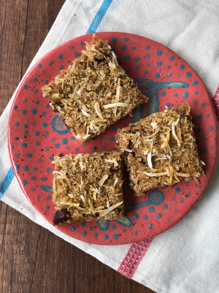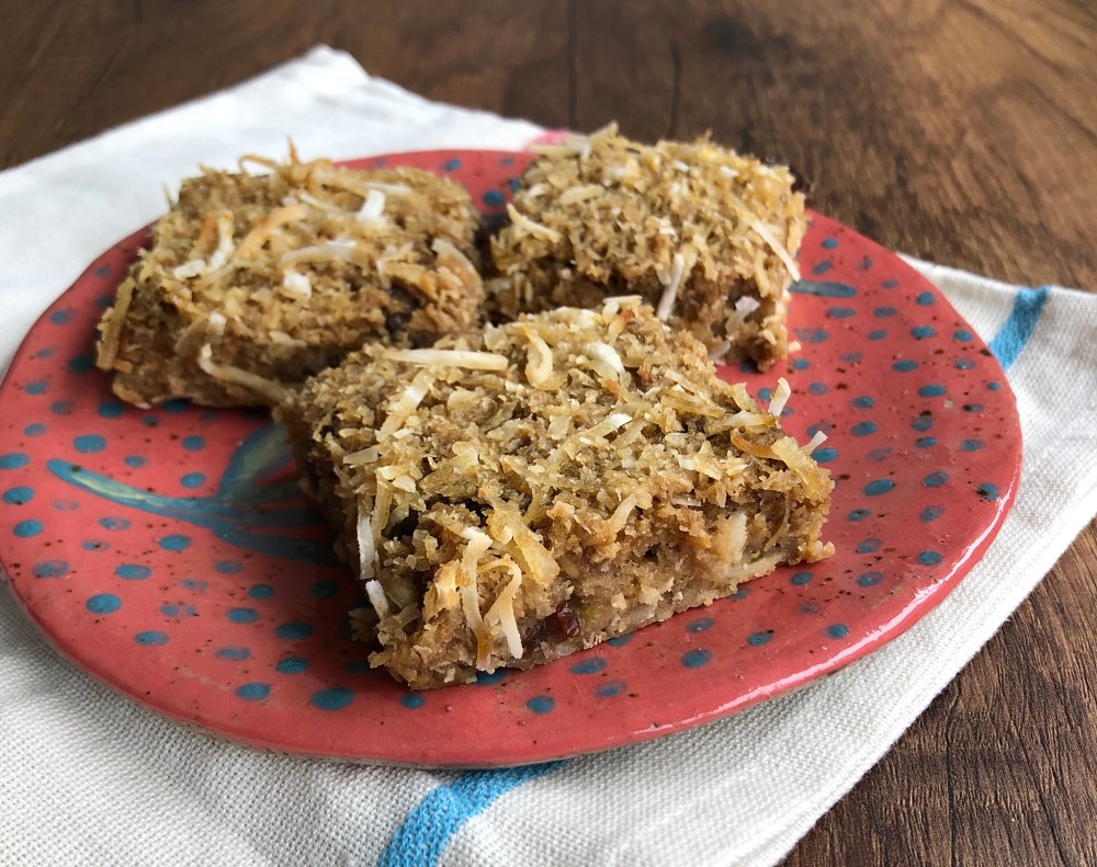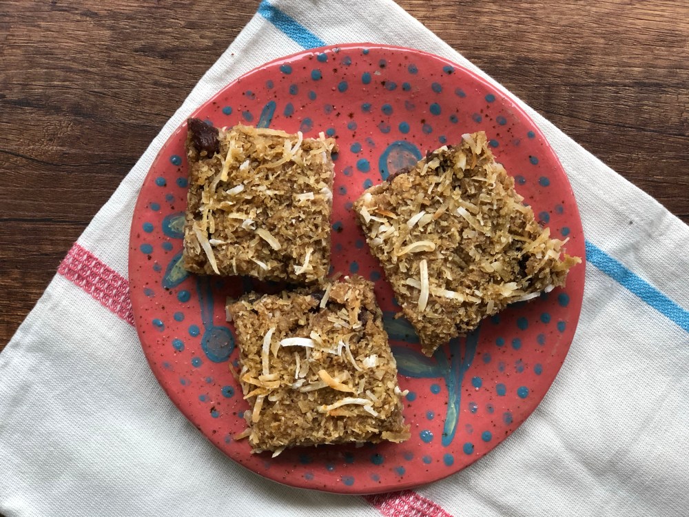 Pasamos nuestra mezcla a un recipiente para horno engrasado (yo uso aceite de coco), idealmente que la preparación quede de unos 2 o 3 cm máximo de alto. Esparcimos por arriba la mezcla de coco rallado y panela restante y llevamos a un horno precalentado a 200 grados, cocinamos unos 15 minutos a esta temperatura y luego bajamos el horno a 180 para continuar cocinando, unos 15 a 25 minutos más, hasta que la superficie esté doradita.