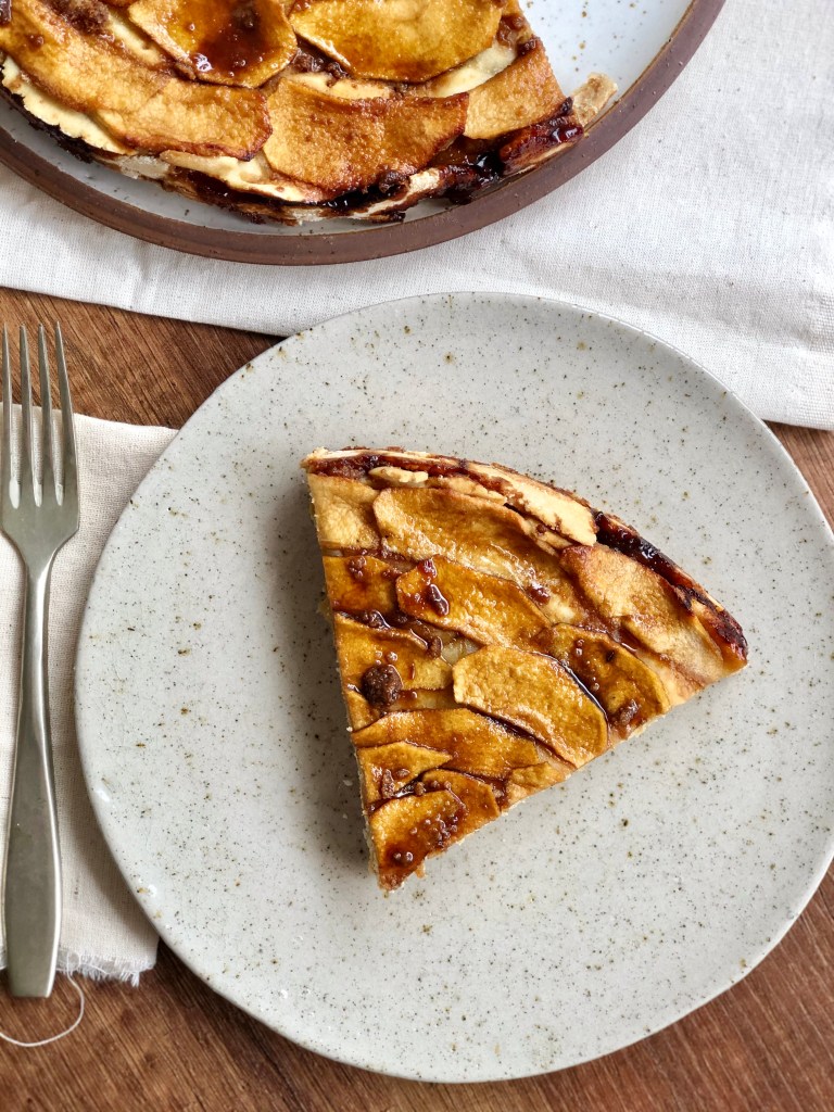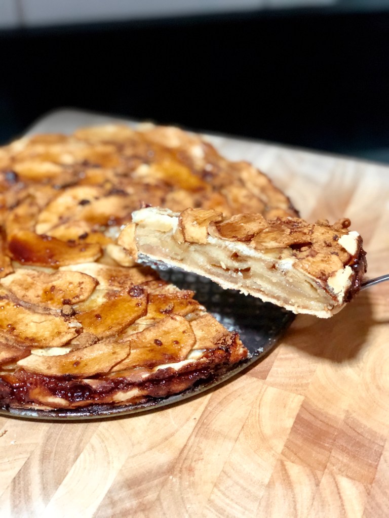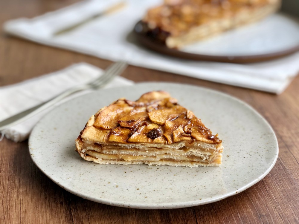 - Pasado el tiempo de reposo de la masa la sacamos de la heladera y la dividimos en 4 o 5 bollos. Estiramos cada uno del tamaño del molde que hayamos elegido y comenzamos a armar nuestra torta. Pincelamos con materia grasa la base del molde y las paredes (recomiendo usar un molde desmontable) y colocamos una capa de masa. La pinchamos y pincelamos con un poco de la leche que habíamos reservado. Colocamos una fila de manzanas fileteadas, aplastamos un poco con las manos y esparcimos azúcar por arriba. Repetimos este paso hasta llegar a la última capa.