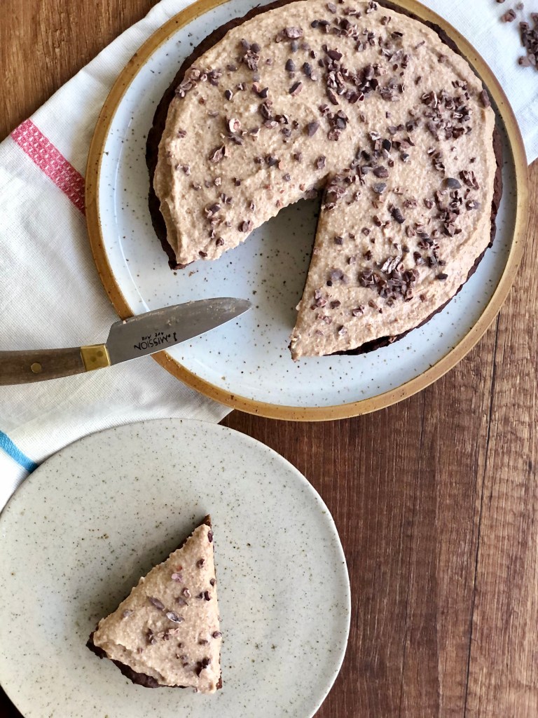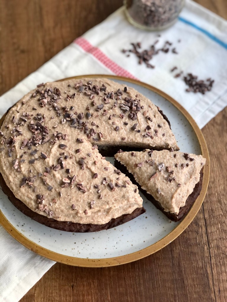 - Por arriba podemos colocar nibs de cacao para terminar sobre el mousse de lúcuma. Si fuera mousse de cacao le quedarían muy bien unos arándanos frescos o algún fruto rojo.