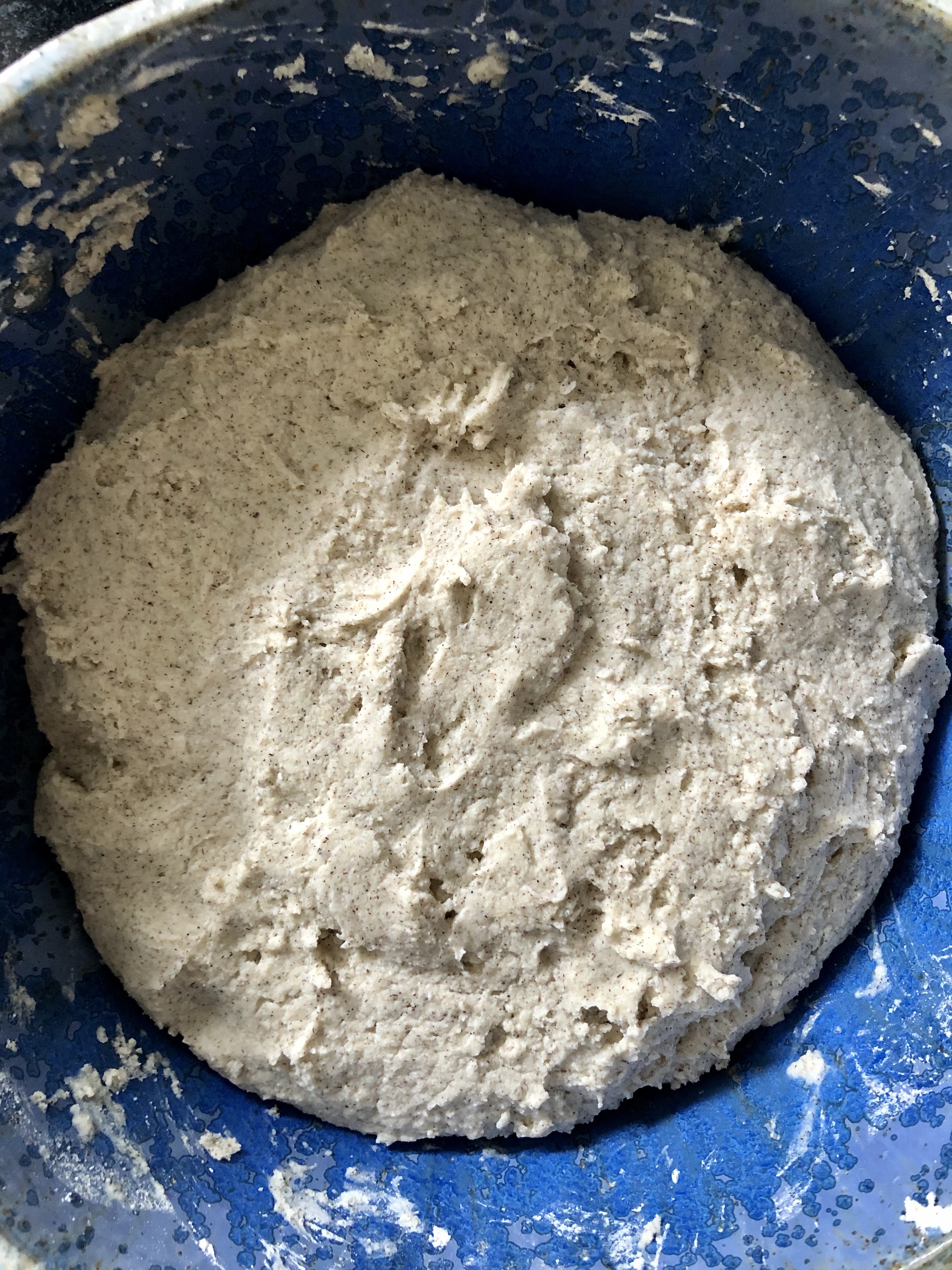 - En un bowl mezclamos las harinas con el resto de los ingredientes secos. Hacemos un hueco en el centro y cuando tengamos el fermento listo lo agregamos y comenzamos a unir la preparación. De a poco agregamos el agua, mezclando en principio con una cuchara de madera y luego continuando con las manos, hasta formar un bollo pegajoso y algo chicloso. Luego continuaremos trabajando la masa hasta lograr el bollo perfecto. Tapamos con un paño y dejamos reposar 1 hora a temperatura ambiente.