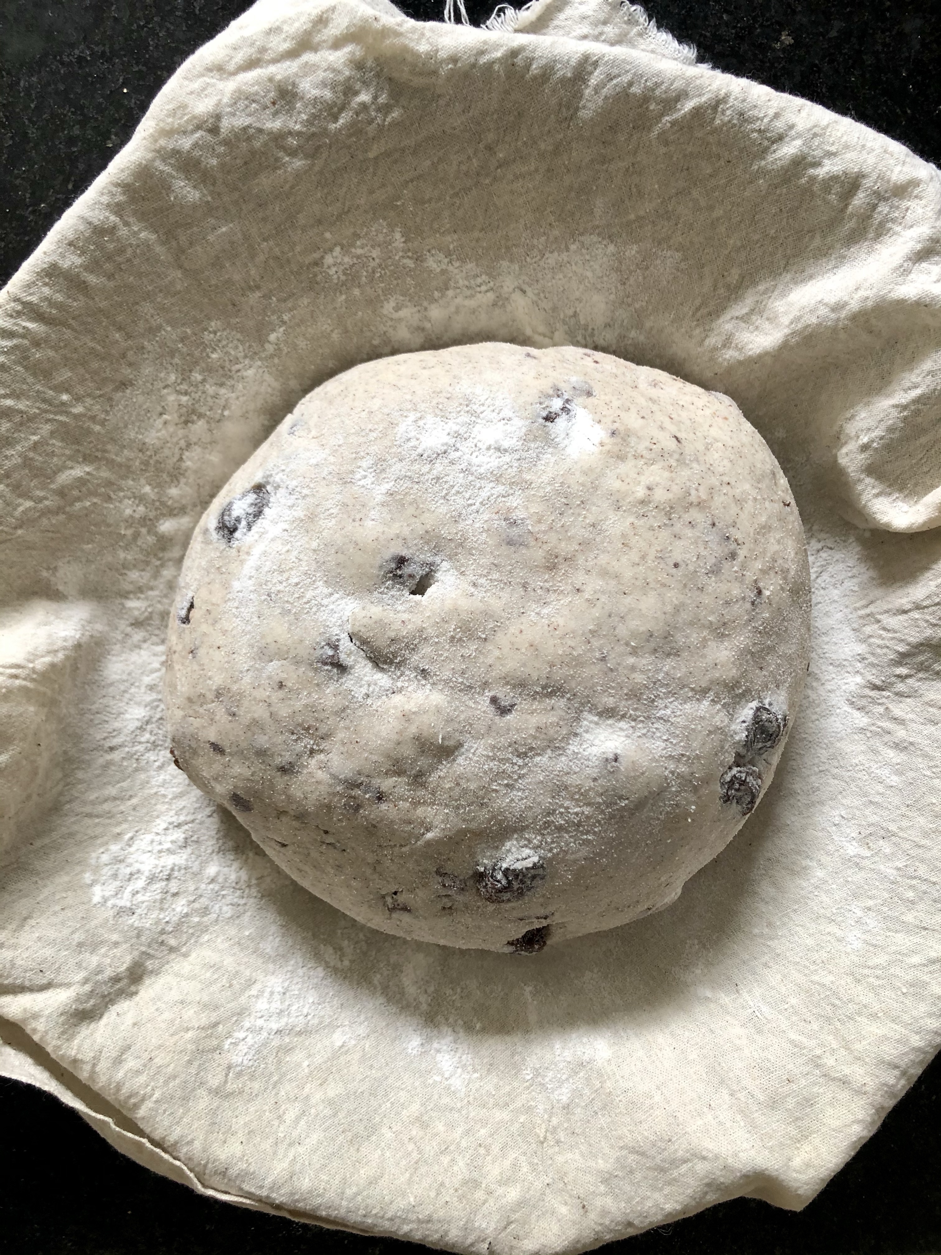 - En el último amasado aplastamos un poco el bollo con las palmas de la mano para aplanarlo un poco y en el centro agregamos los trocitos de chocolate y las pasas. Integramos con la masa hasta lograr nuestro bollo perfecto. Lo colocamos en un recipiente para pan enharinado. Si no tenés recipiente para pan podes improvisar uno como yo, utilizando un bowl grande y colocando un paño de cocina. Colocamos allí nuestro bollo y lo dejamos leudar hasta que duplique su volumen o incluso llegue al borde del bowl. El tiempo dependerá de la temperatura del ambiente, puede ser entre 4 y 6 horas, o hasta 8.
