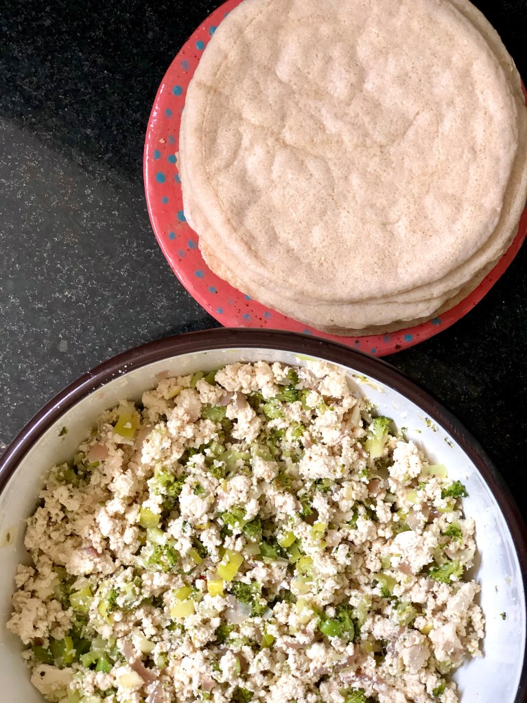 - Por último agregamos al cuenco de tofu las verduras salteadas, mezclamos y reservamos (Cuando tengas la salsa blanca lista, agrégale 2 cdas al relleno para darle más cremosidad).
