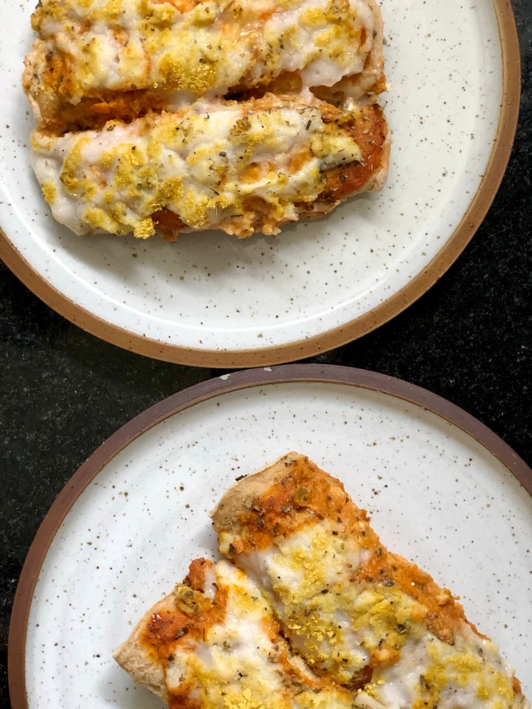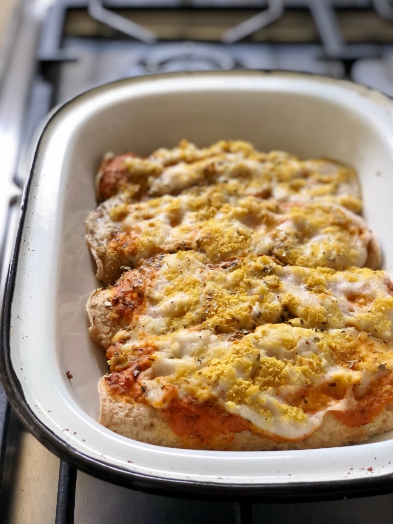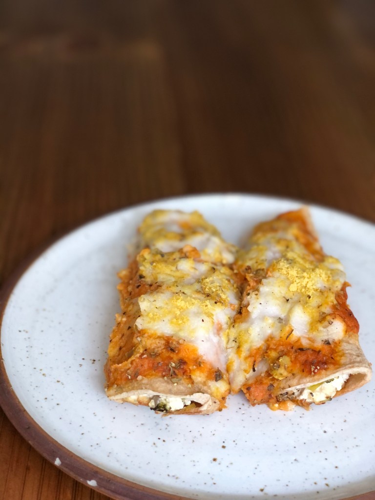 - Cubrimos por arriba con salsa roja primero, luego salsa blanca y por arriba esparcimos un poco de levadura nutricional y orégano.