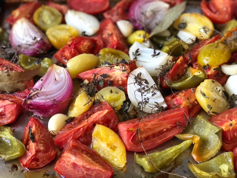 - Cocinamos en horno precalentado a 180 / 200 grados por unos 30 a 40 minutos, hasta que los tomates se arrugan un poco. Cuando esté lista, retiramos del horno y dejamos enfriar un poco.