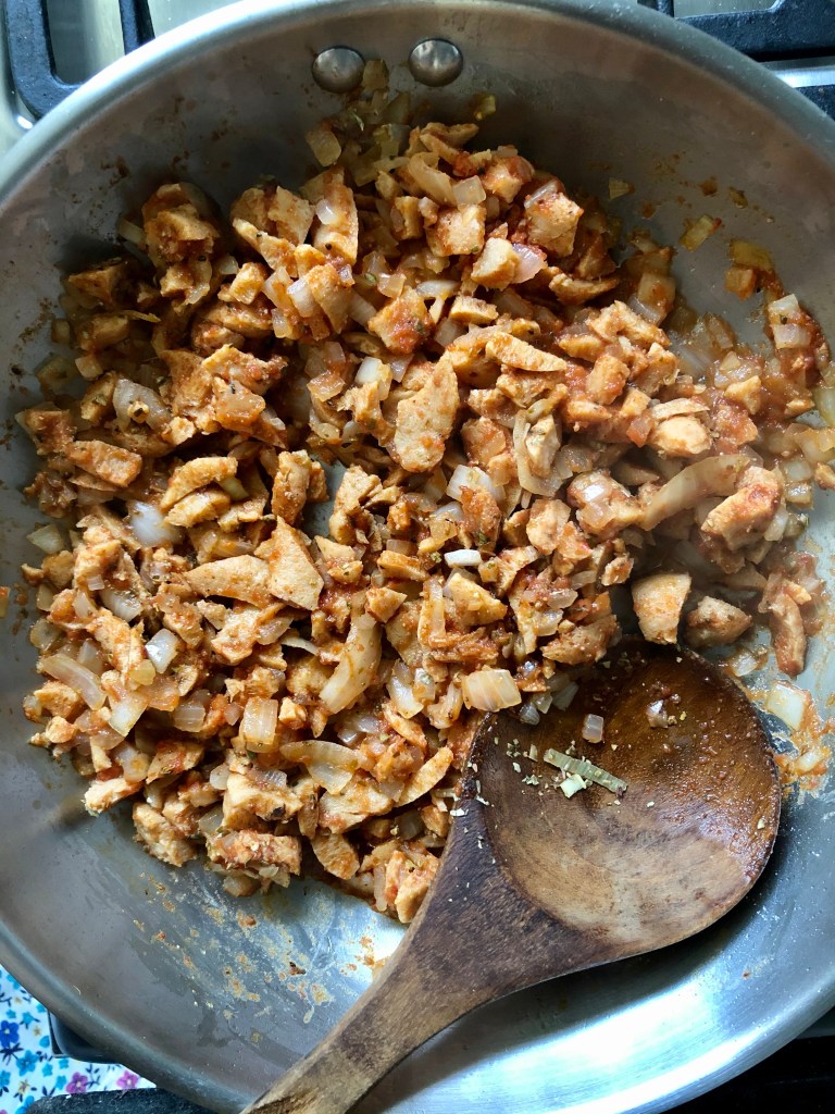 - Picamos la cebolla bien chiquita y la doramos en una sartén en un poquito de aceite de oliva. Cuando comience a dorarse agregamos la soja texturizada y la salsa de tomate. Condimentamos con sal, pimienta, pimentón dulce y orégano, mezclamos y cocinamos por unos minutos.
