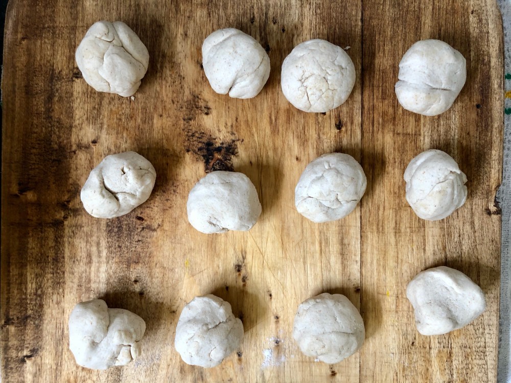 - Transcurrido el tiempo de reposo, para armar las tapas dividimos la masa en 12 bollitos del mismo tamaño. Espolvoreamos una superficie con un poco de harina de arroz y estiramos con un palo de amasar, hasta que quede bien delgada. Si necesitamos, nos ayudamos a darle forma con algún elemento circular (yo usé un bowl de desayuno) y cortamos con ayuda de un cuchillo por el borde.