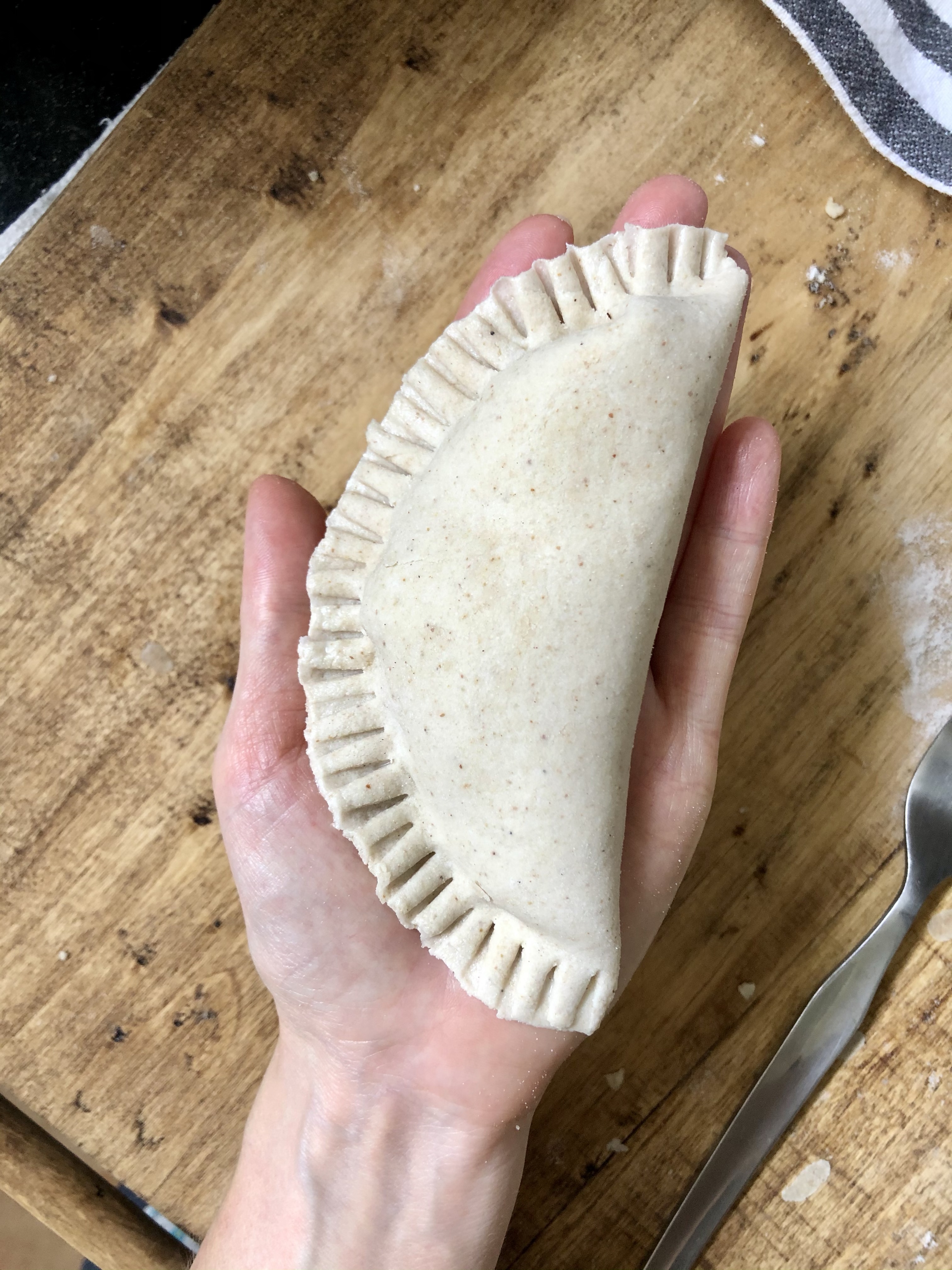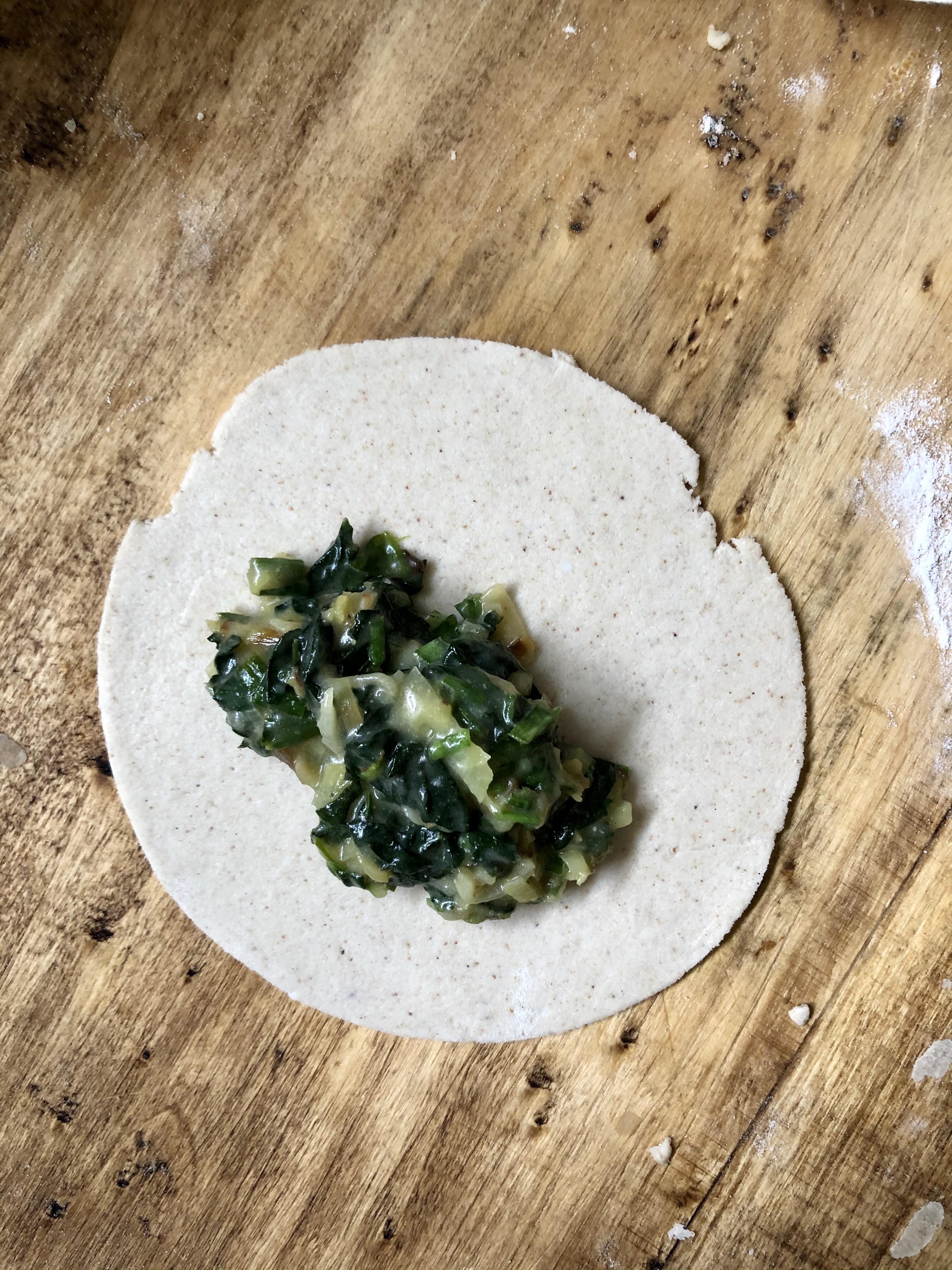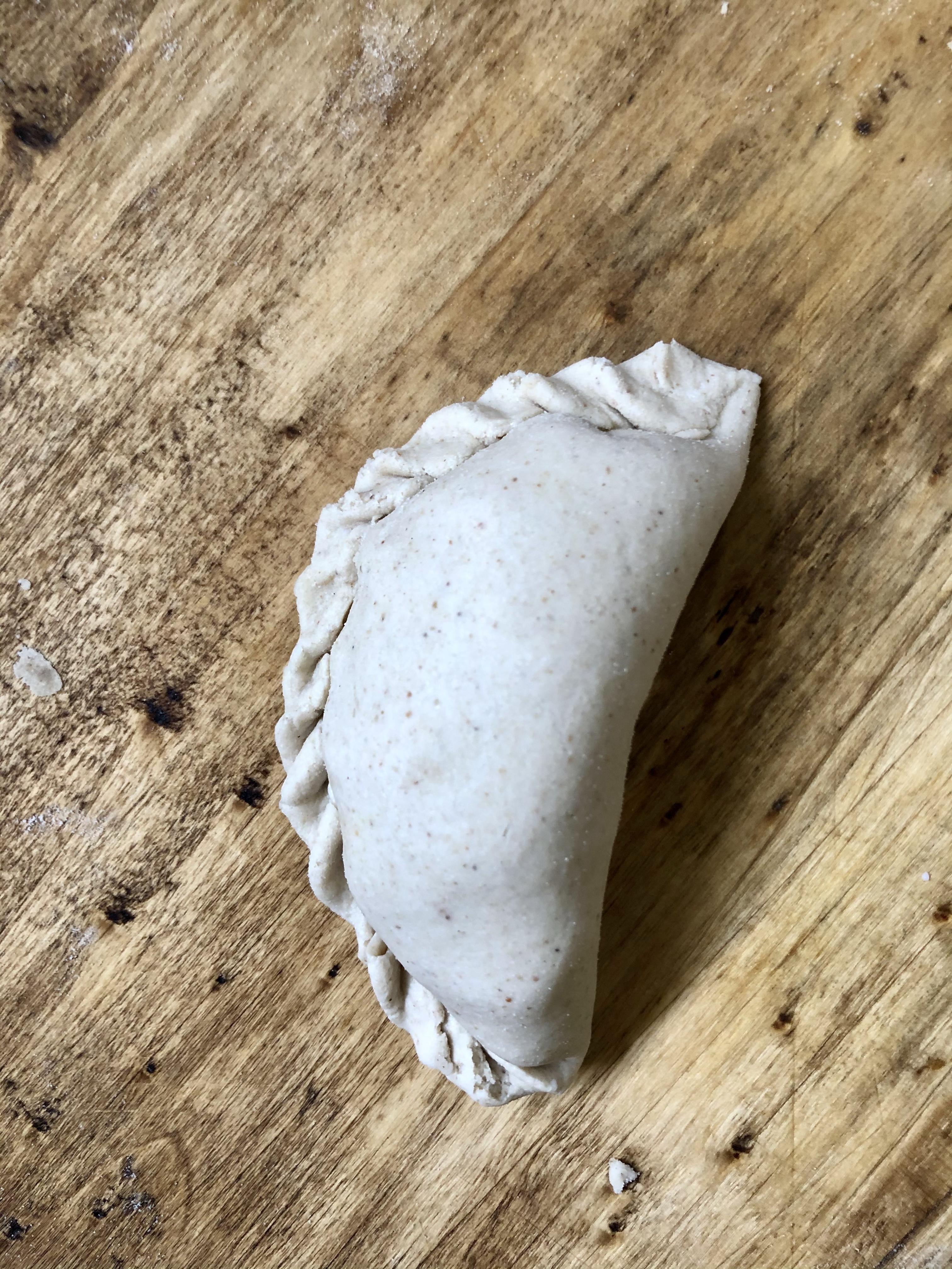 - Tomamos un disco de masa y colocamos en el centro el relleno. Mojamos nuestro dedo índice o medio en un cuenco con agua y lo pasamos por todo el borde de la tapita, esto nos ayudará a que se pegue mejor. Doblamos la masa sobre el relleno, juntamos los bordes y presionamos suavemente para unir todos los extremos. Ahora si, repulgamos. Como tenemos dos rellenos, recomiendo utilizar dos tipos de repulgue diferentes. (*)
