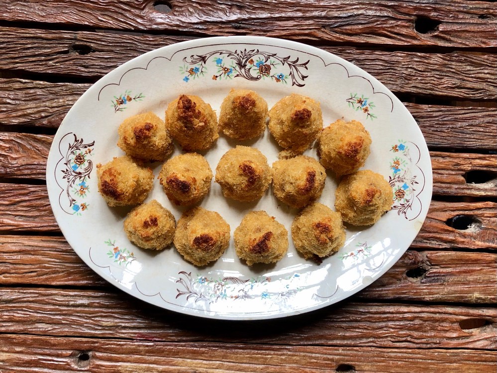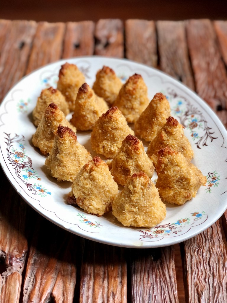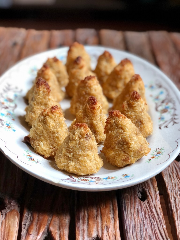 - Cuando logramos nuestro bollo, con una cuchara o directamente con nuestros dedos, tomamos pequeñas porciones y formamos bolitas, presionando suavemente. Luego le damos forma de conito y los colocamos sobre una placa ligeramente aceitada, o con papel mantequilla.