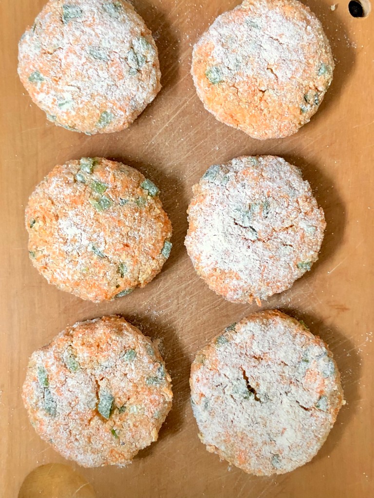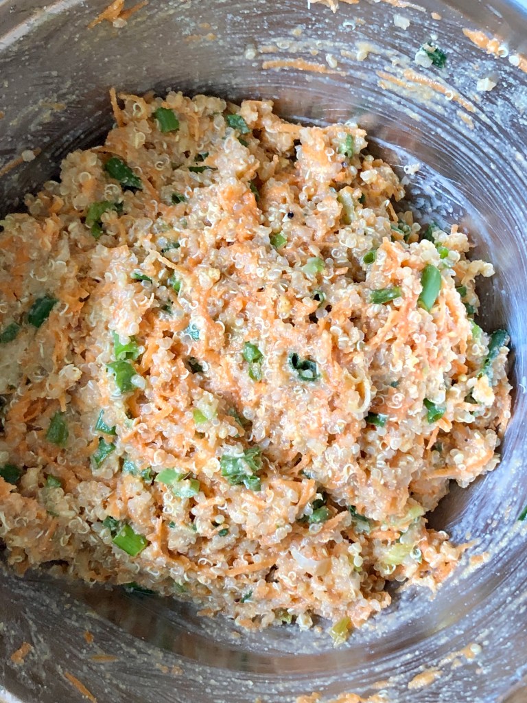 - En un bowl combinamos todos los ingredientes: quinua cocida, zanahoria rallada, cebollita de verdeo salteada, lo verde de la cebollita de verdeo picado, las cucharadas de harina de garbanzos, huevos ecológicos y condimentos. Unimos hasta formar una masa manipulable y cuando la tengamos la llevamos a refrigerar y reposar de 30 minutos a una hora.